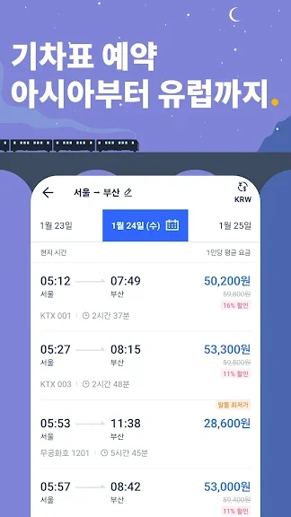 [국내 기차표] 트립닷컴은 대한민국 국유 철도 운영사인 코레일과 제휴를 맺은 유일한 해외 판매처입니다. 서울, 부산, 목포, 광주 및 국내 기타 지역으로 가는 기차표를 다양한 유형으로 제공해 드립니다.