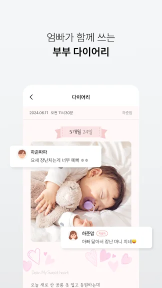 또한, 엄빠가 함께 사용할 수 있는 다이어리 기능은 초음파 사진, 첫 걸음마 순간 등 특별한 순간들을 기록으로 남길 수 있어, 소중한 기억을 함께 나누는 재미도 두 배입니다.